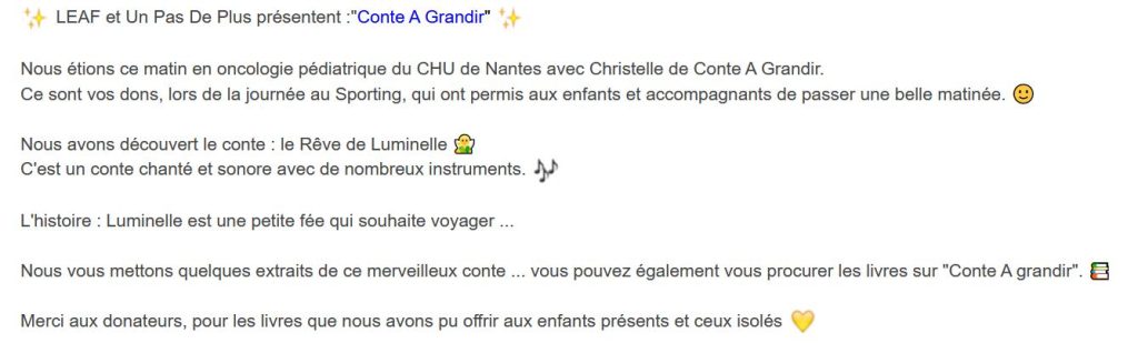 LEAF affectera cette somme à l’activité MUSIC CARE que nous avons mis en place dans le Service d’Hématologie Clinique et dans le Service de Pédiatrie au CHU de NANTES et aussi aux Consultations d’Algologie (Traitement de la douleur) au CH de SAINT NAZAIRE. Et à l’ESEAN à NANTES.